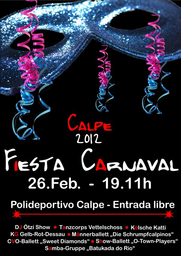 Der Carnaval Club Calpe 1982 (CCC) feiert am 25.Februar 2012 sein Musik- und Tanzfestival um 20:00 Uhr und am 26.Februar 2012 das Karnevalsfest um 19:11 Uhr in der städtischen Sporthalle mit freiem Eintritt.
